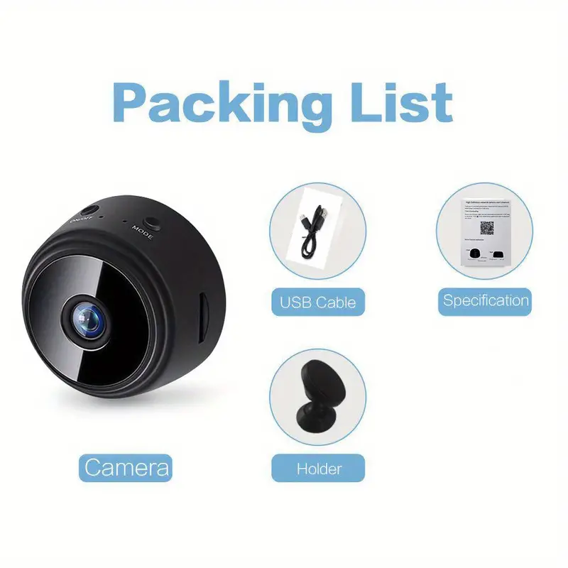 A9 Mini WiFi Camera: The main device, compact in size and equipped with features such as a lens, infrared sensors for night vision, motion detection capabilities, and WiFi connectivity.